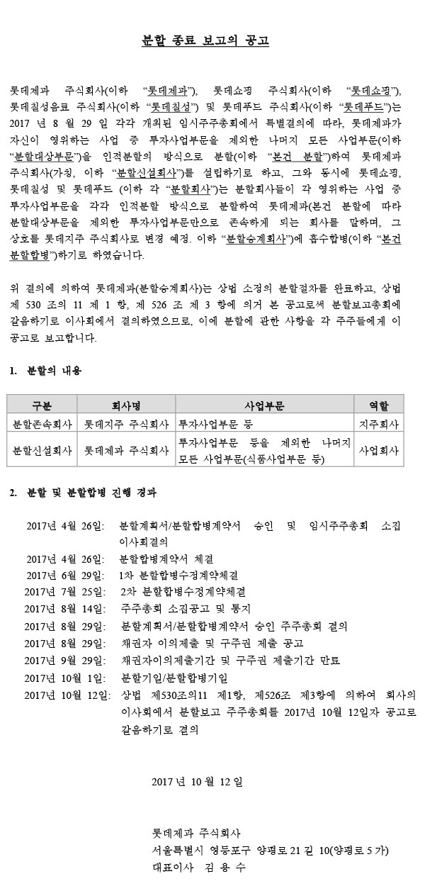 분할합병 종료 보고의 공고 목록 주식분할에 따른 주권제출 공고