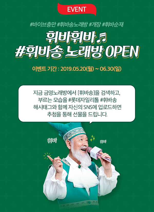 휘바송 노래방 이벤트는 금영노래방 기기에서 97935번을 입력, 롯데 자일리톨 휘바송을 부르는 모습을 찍고 ‘#롯데자일리톨#휘바송’ 해시태그와 함께 자신의 SNS에 업로드하면 내부 평가를 통해 10명을 선정하여 블루투스 마이크 등의 선물을 선사하는 이벤트다. 노래방 이벤트 또한 6월 30일까지 진행된다.