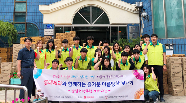 롯데제과는 국제청소년연합에서 주관하는 대학생 해외봉사자를 대상으로 하는 ‘2019 월드문화 캠프’에 꼬깔콘, 퀘이커 쿠키 등 과자 470박스를 지원했다. 또한 롯데제과는 8월 11일 진행되는 중고등학생 대상 ‘전국청소년자원봉사대회’를 지원하기 위해 ‘나눔코리아’에 빼빼로, 치토스 등 과자 406박스를 전달했다.
